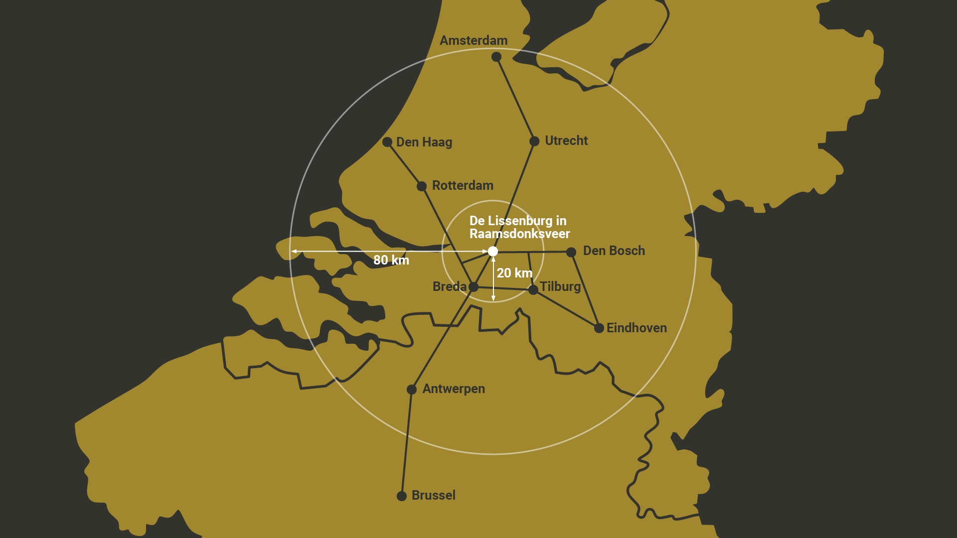 Gelegen in Raamsdonksveer, biedt De Lissenburg uitstekende verbindingen met de belangrijkste economische regio’s. U reist snel naar de Randstad, Brainport Eindhoven, en de Vlaamse Ruit, terwijl ook de voornaamste Europese zeehavens nabij zijn.