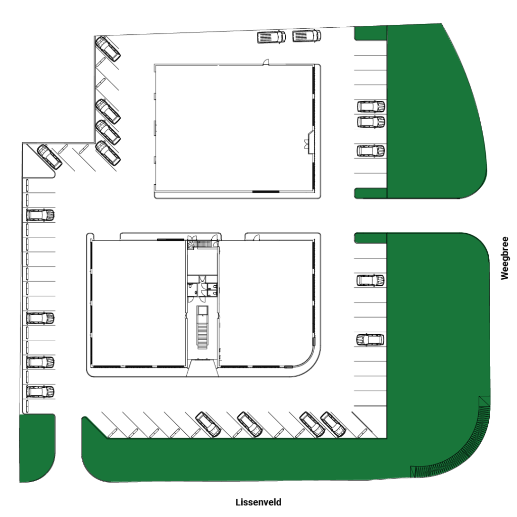 Achter de groenstrook, wordt er voor gezorgd dat het buitenterrein van de Lissenburg van alle moderne functionaliteiten is voorzien. Het terrein zal beschikken over 65 parkeerplekken, waarvan er 14 uitgerust worden met een voorziening voor laadpalen voor elektrische voertuigen. Voor medewerkers en bezoekers die met de fiets komen, is er ook een overdekte fietsenstalling voorzien.